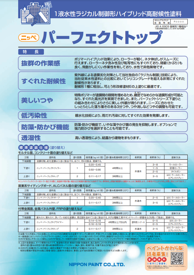 ■高作業性 ポリマーハイブリッド効果により、ローラーが軽く、ネタ伸ばしがスムーズに行えます。ローラーネタ含み性および転写性にもすぐれており、隠蔽(カブリ)も良く、飛散がしにくい作業性を有しており、水性で非危険物です。 ■高耐候性 紫外線による塗膜劣化対策として独自の「ラジカル制御」技術により、シリコングレードを超える非常にすぐれた耐久性があります。耐候形1種に相当し、可とう形改修塗材Eの上塗りに最適です。 ■高光沢 ポリマーが塗膜間の隙間を埋めるため、緻密な塗膜形成が可能となり、すぐれた高光沢を実現できました。また、パーフェクトシリーズ下塗り(パーフェクトフィラー・パーフェクトサーフ・パーフェクトプライマー)との組み合わせによりさらに美しい外観が得られます。ニーズに合わせたしっとりとした落ち着きのある3分つや、つや消しなど、つやの調整も可能です。 ■防藻・防かび性 防藻・防かび機能を有しています。オプションにより強力防かびも可能です。 ■低汚染性 親水化技術により、雨だれ汚染から建物を守ります。
