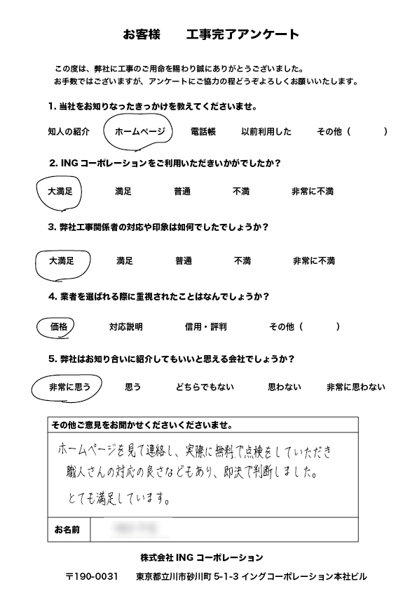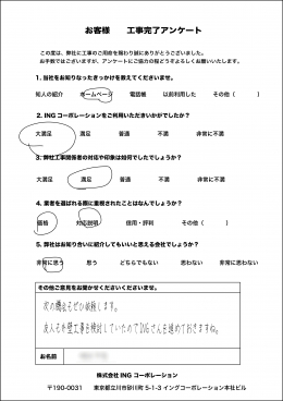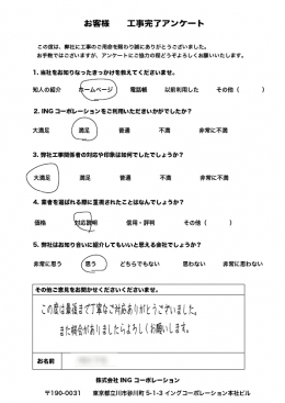 我が家も築25年が経ち、そろそろ塗り替えをしなければな、と思っていました。そんなタイミングで飛び込み営業の方が来たので改めて意識するようになり、 ネットで検索した時にINGさんを見つけました。 アフターサポートや実績の多さなどで、塗装を依頼することに決めて連絡しました。 最初から最後まで説明をして下さり、仕事も丁寧でした。 職人さんたちも毎度挨拶して下さったりと接しやすく、好印象です。 提案して頂いた色に塗り替えするのは、正直少し不安でしたが、 完成を見ると家を建てた時のような胸の高鳴りがありました。 仕上がりに大満足です! 知り合いの方も何人か塗装や工事をしたいと言っていたので、おススメしてみようと思います。 ありがとうございました! |